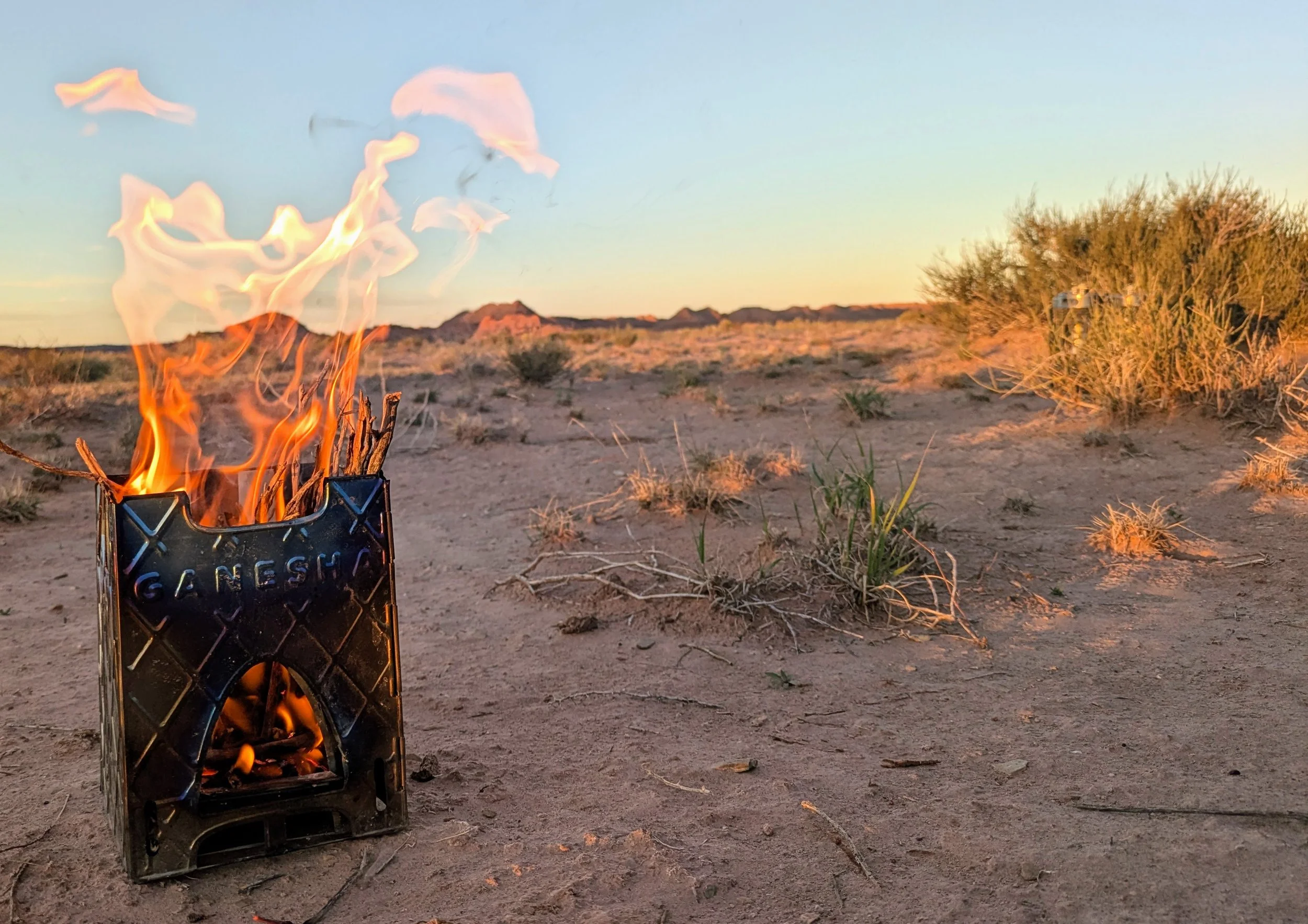 The Solo stove most comparable in firepower and ease of use is the Solo Campfire. We did a 7-day backpacking trip with this stove, and cooked all our meals on it. BUT it weighs 35.2 oz vs. 7.8 oz for the Ganesha Ultralight titanium. It’s the size of a rice cooker (7” diameter, 9.5” high), and doesn’t fold flat.